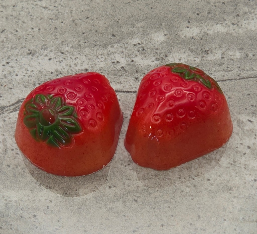 White chocolate shell, with a white chocolate strawberry ganache