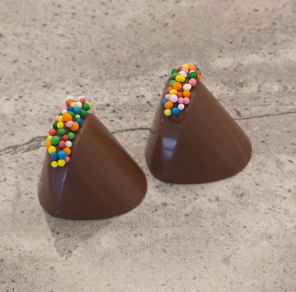 Milk chocolate shell, with a whipped white chocolate vanilla ganache with 100s & 1000s