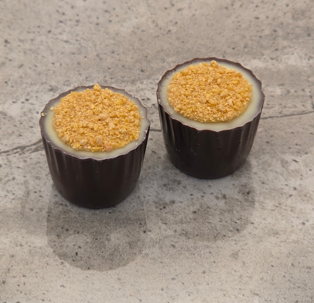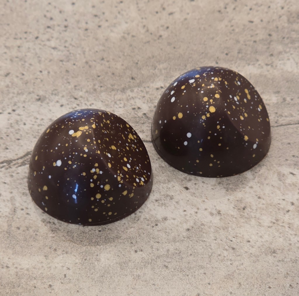 Dark chocolate shell, with a creme brulee filling, topped with white chocolate and gold sugar