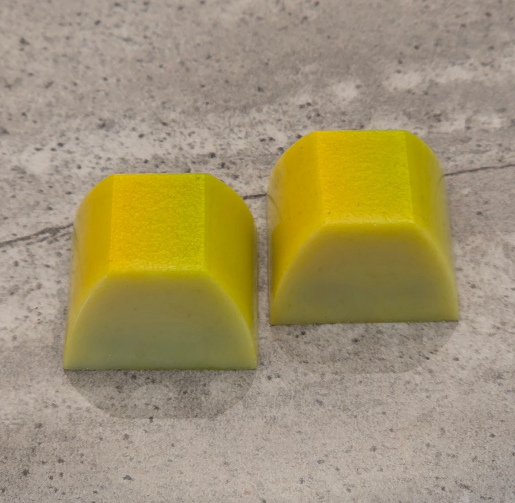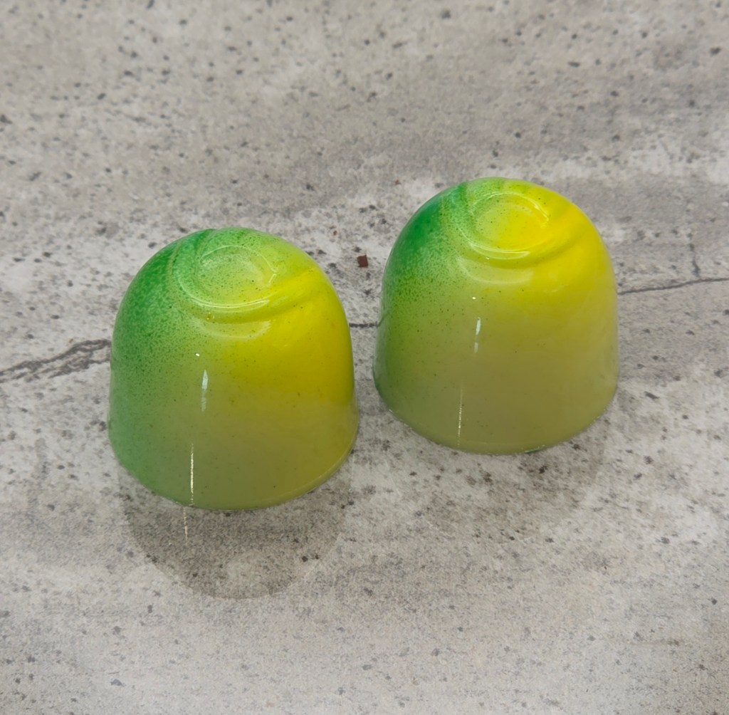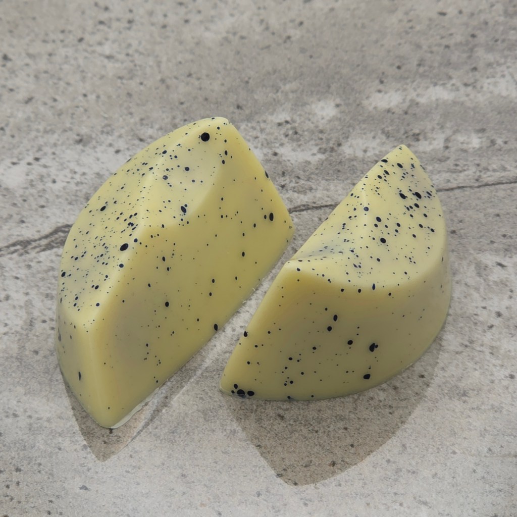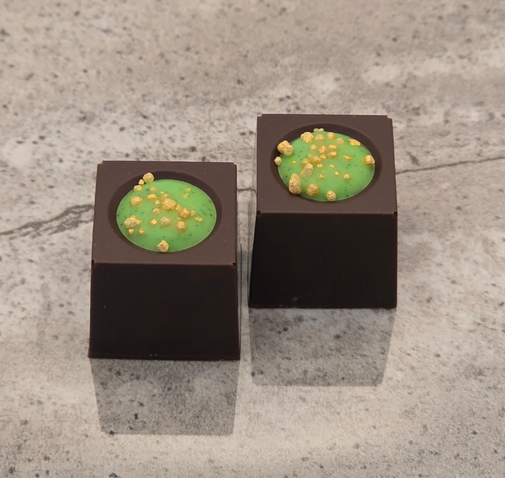 White chocolate shell, with a dark lime ganache, and white chocolate lemon ganache