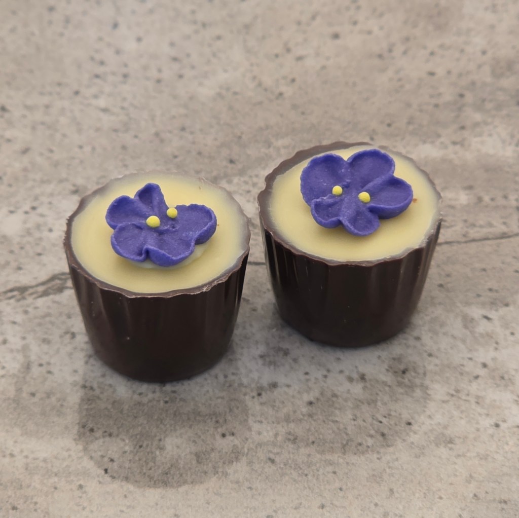 Dark and white chocolate shell, with a milk chocolate lavender ganache