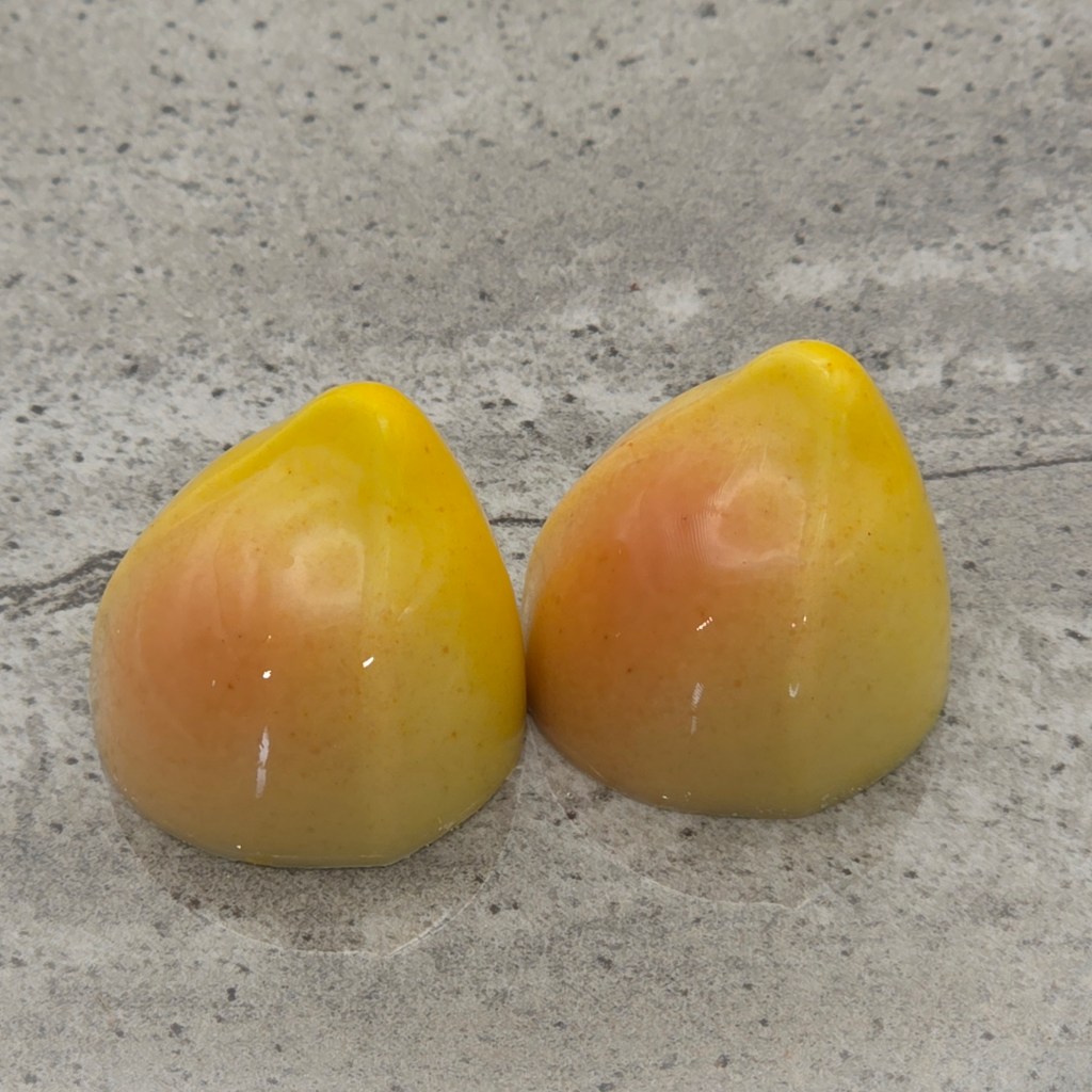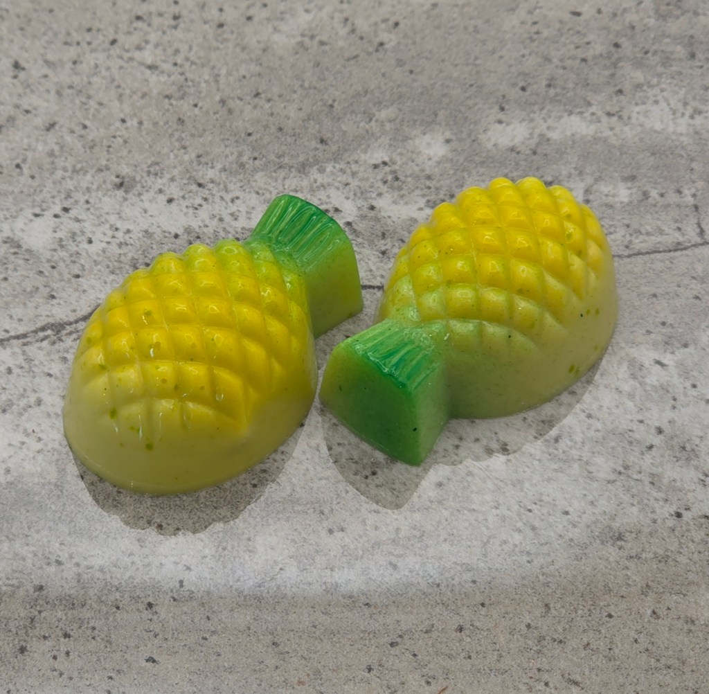 White chocolate shell, with a milk chocolate pineapple ganache