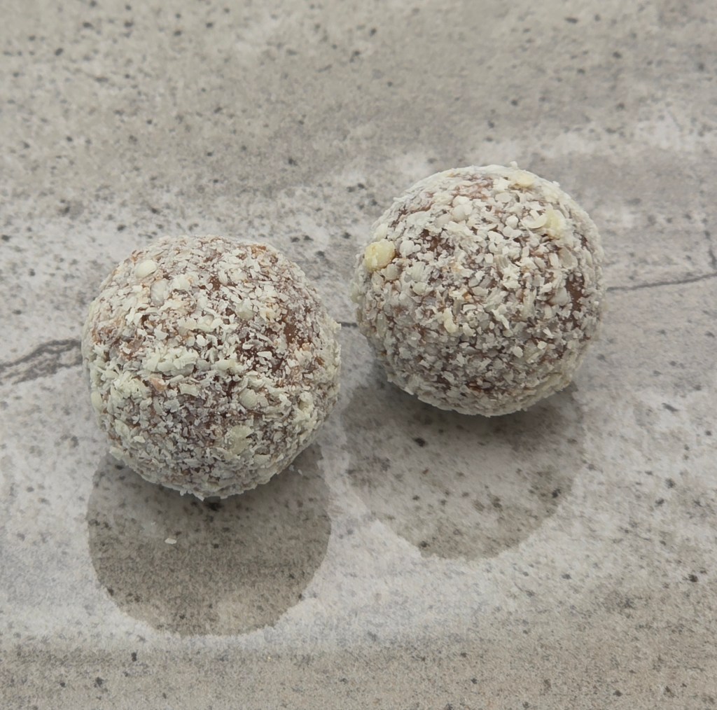 Milk chocolate shell, with liquid Butterscotch Schnapps, covered in white chocolate shavings