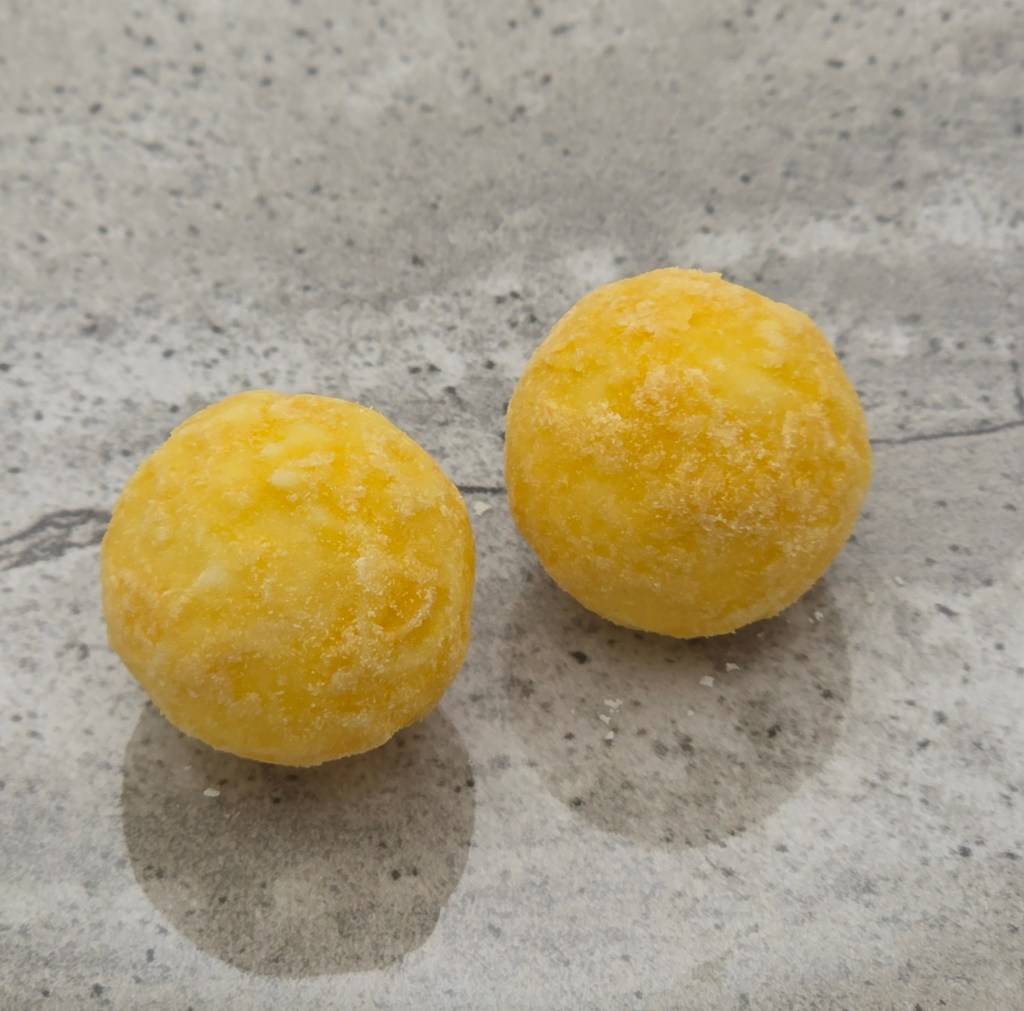 White chocolate shell, with liquid gin, covered in passionfruit powder