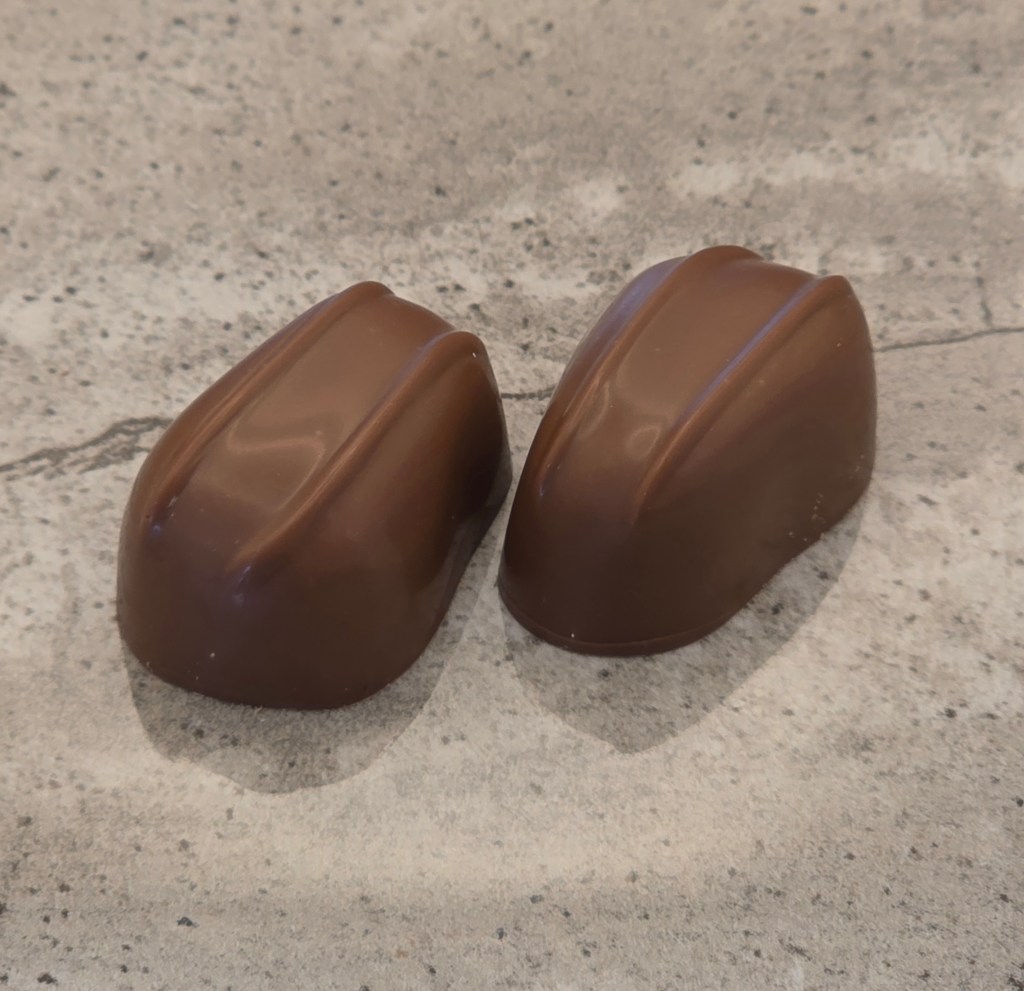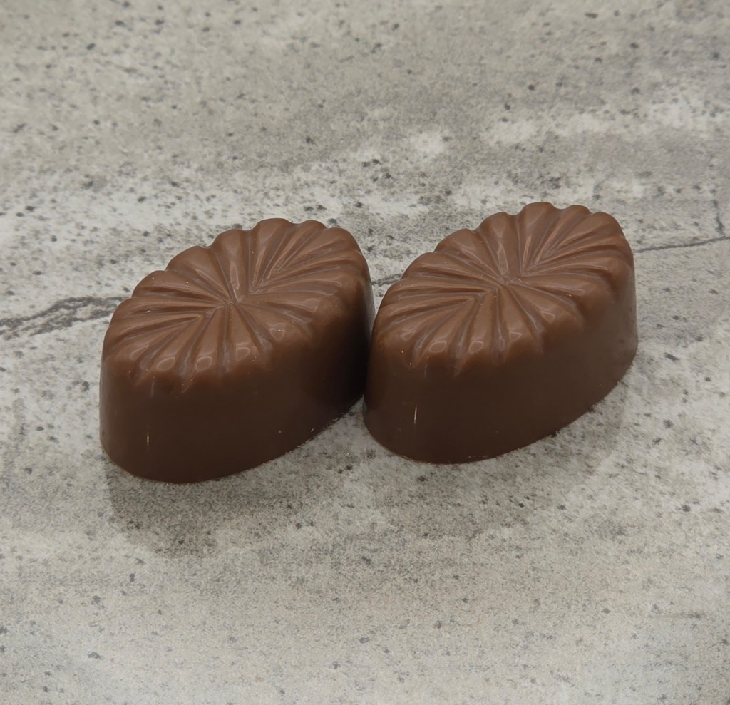 Milk chocolate shell, with a white chocolate mango ganache