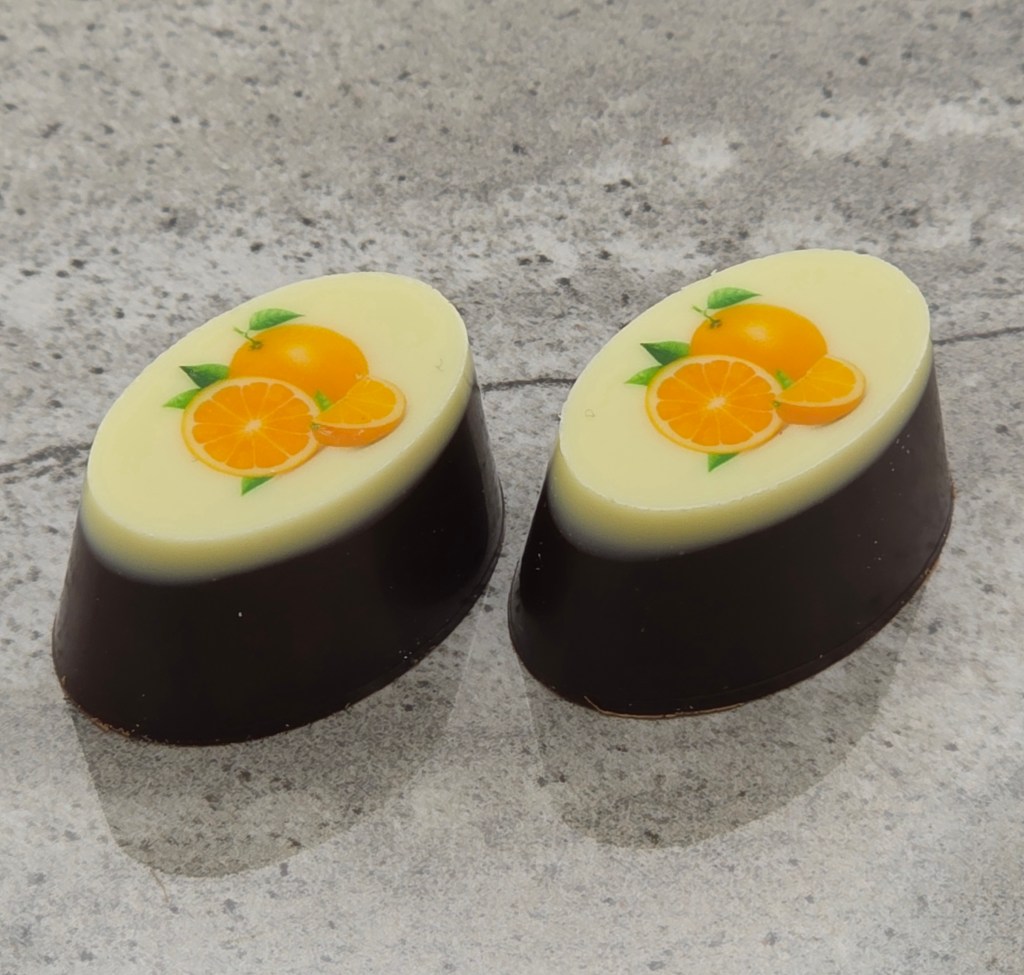 Dark and white chocolate shell, with a white chocolate orange ganache