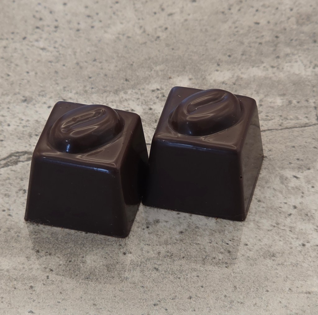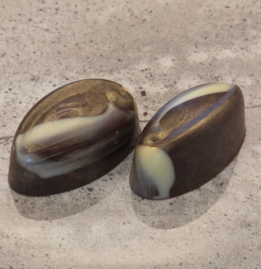 Dark chocolate shell, with a dark chocolate coffee grounds ganache