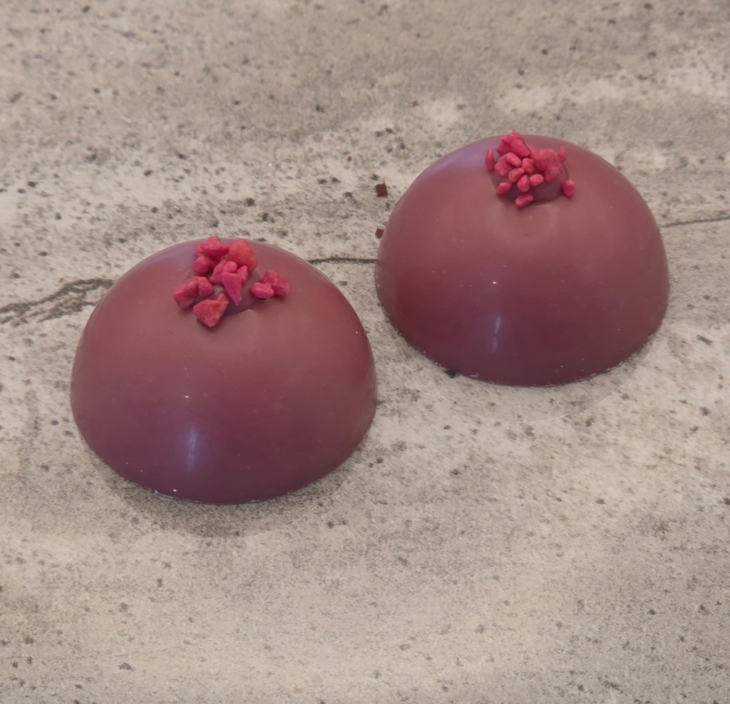 Ruby chocolate shell, with a white chocolate vanilla and cranberry ganache